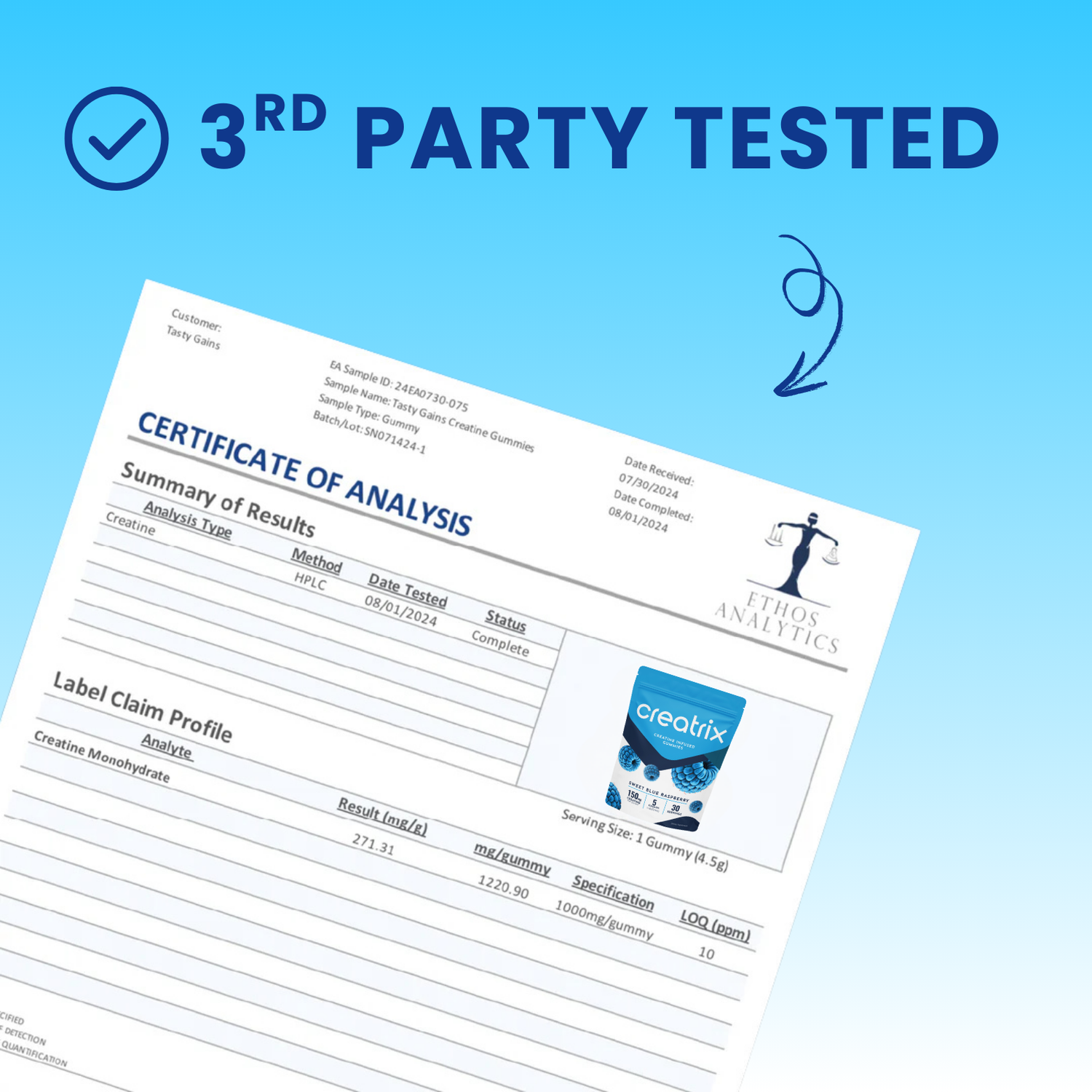 At Creatrix, we don’t cut corners. Our creatine gummies are 3rd party tested for quality, safety, and real results. While many brands skip this step, we believe in doing things right. Each batch is checked for purity, so you know exactly what you’re getting—no fillers, no guesswork. We stand behind every gummy because your health and performance matter most.